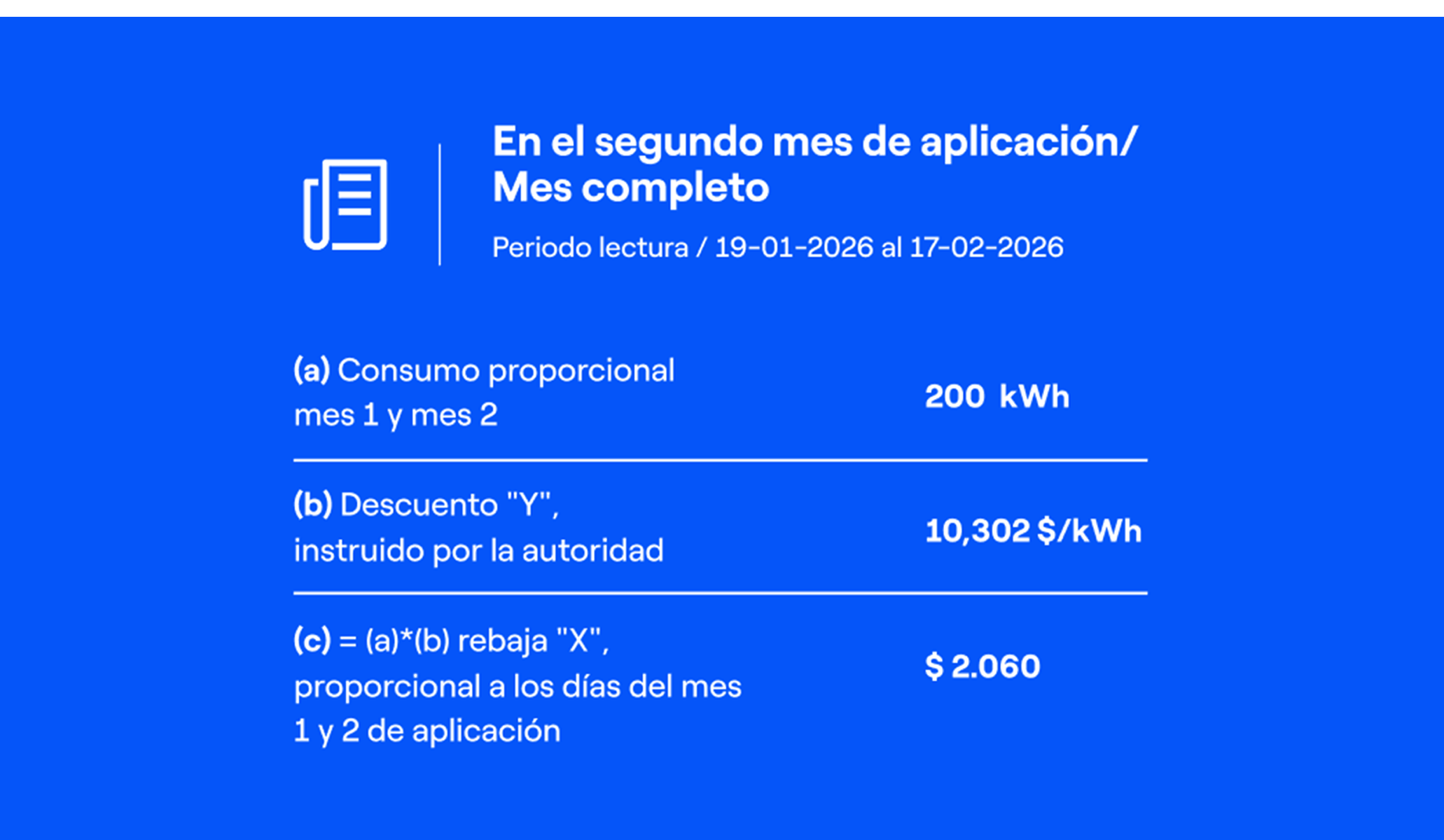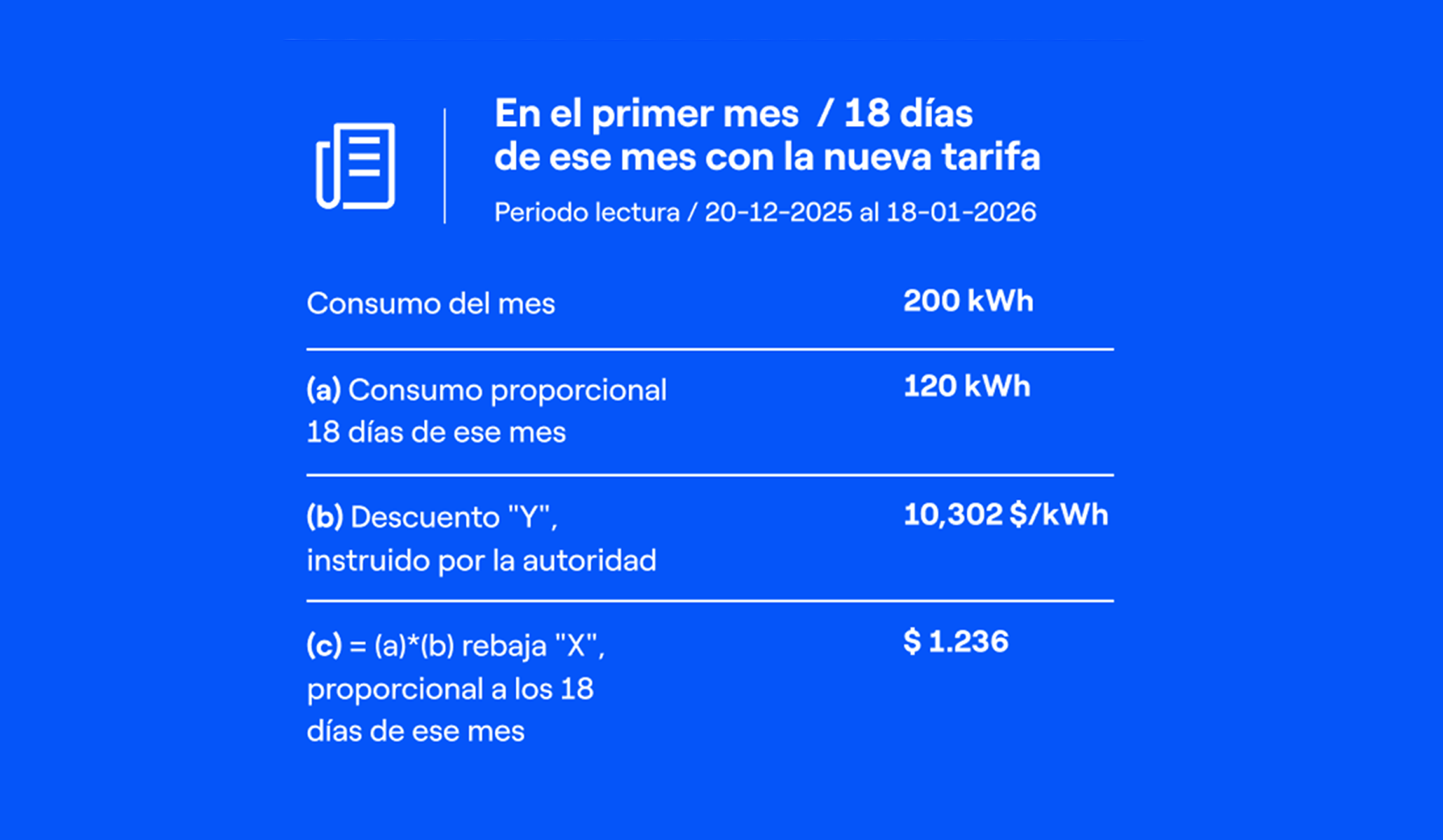 Para una cuenta con un consumo promedio de 200 kWh, en el primer mes de aplicación la rebaja será propocional a los días de ese es que estén afectos a la nueva tarifa.